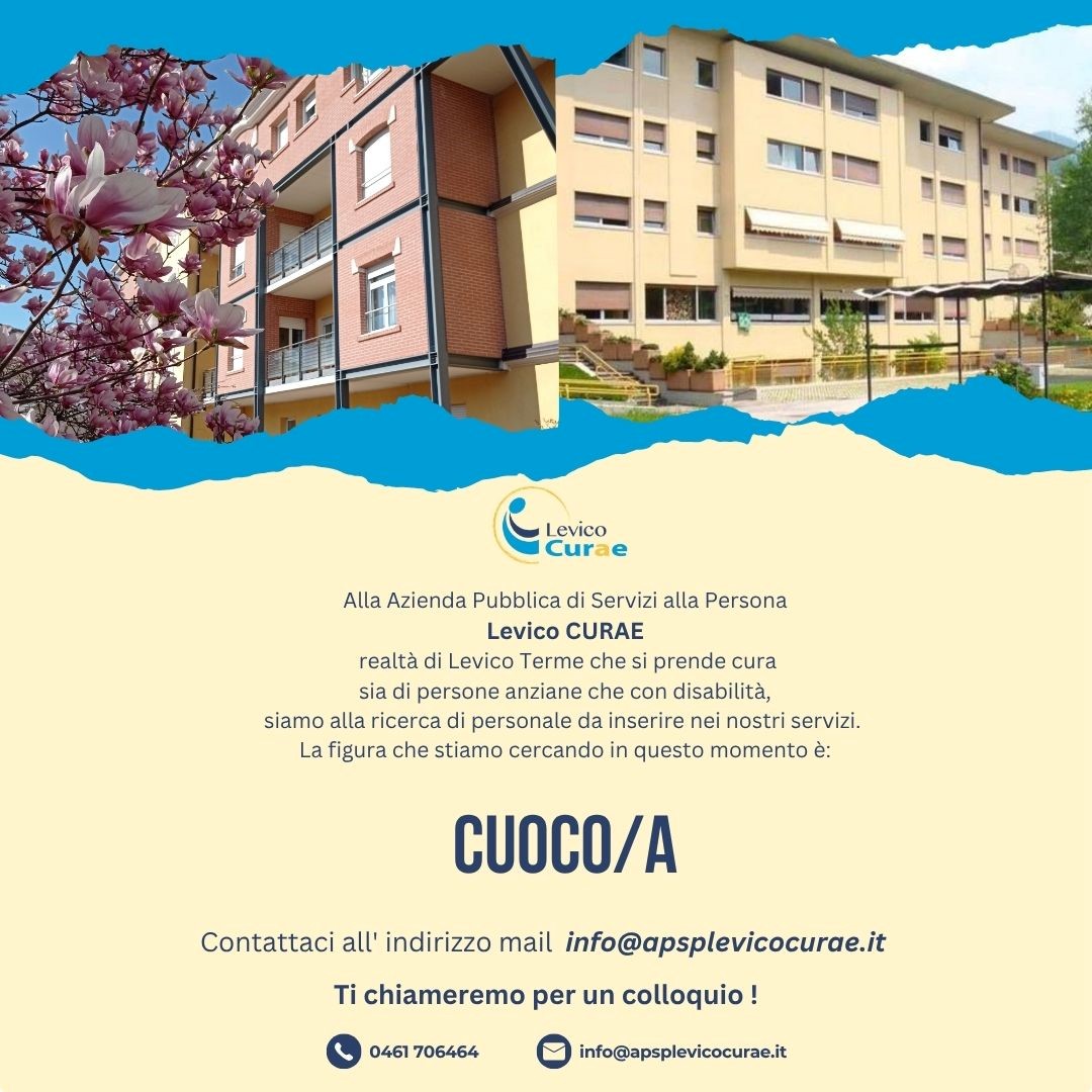 L'A.P.S.P. Levico CURAE, realtà di Levico Terme che si prende cura sia di persone anziane che con disabilità, è alla ricerca di personale a tempo determinato da inserire nei nostri servizi con la figura professionale di Cuoco.
